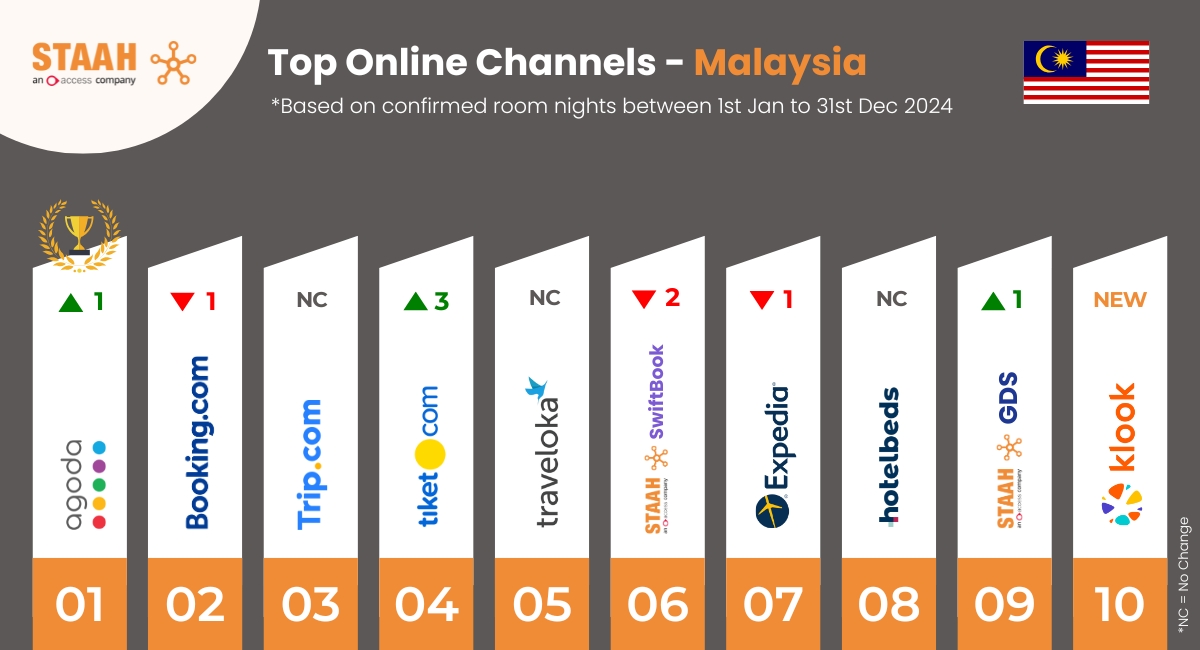 Di Malaysia, Agoda, Booking.com, Trip.com, Tiket, dan Traveloka menempati lima posisi teratas. Pemesanan langsung melalui situs web hotel melambat di kawasan tersebut, turun dua peringkat. Expedia dan Hotelbeds tetap menjadi yang teratas sementara Klook yang berbasis di Hong Kong muncul pertama kali di daftar 10 teratas. STAAH GDS mempertahankan posisi nomor 9 di daftar 10 teratas, menegaskan kembali kinerjanya yang konsisten dan dapat diandalkan.