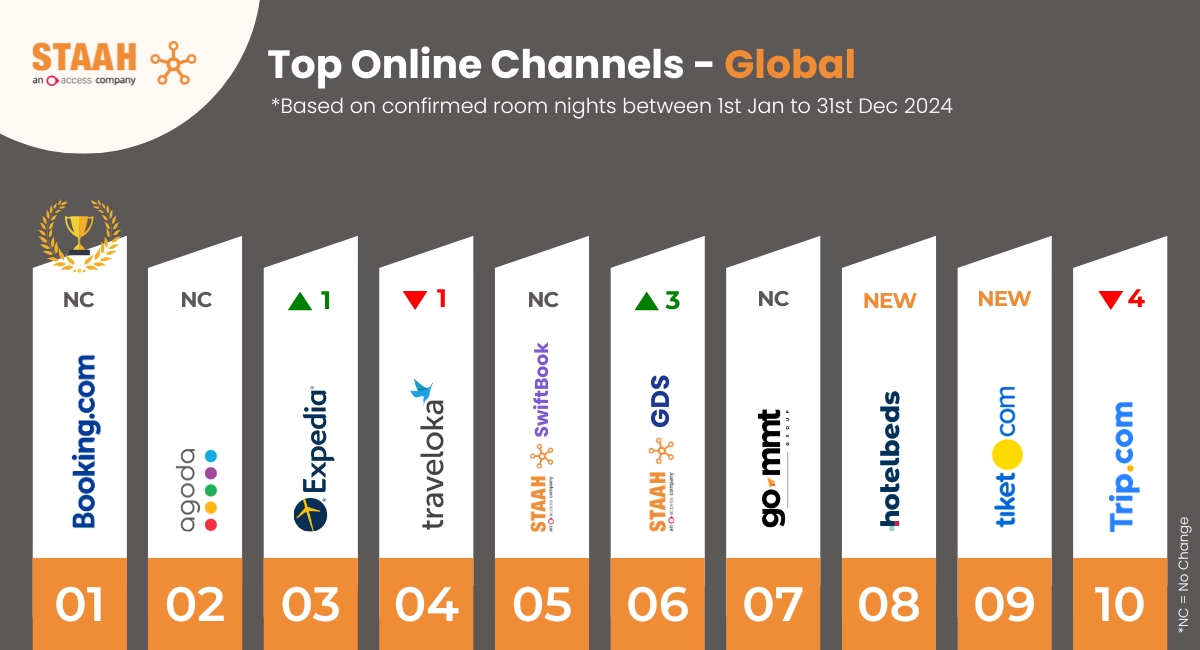 - Các nền tảng đặt phòng nổi tiếng như Booking.com, Expedia và Agoda tiếp tục thống trị thị trường, nhờ khả năng ảnh hưởng đến mọi giai đoạn của hành trình đặt phòng. Ngoài ra, các OTA theo vùng như GoMMT (Ấn Độ & Sri Lanka), Traveloka và Tiket.com (Đông Nam Á), hay Pitchup.com (Anh) cũng có mặt trong top dẫn đầu. Trip.com và hệ thống phân phối phòng Hotelbeds cũng ghi nhận sự tăng trưởng mạnh tại nhiều khu vực. Trong khi đó, Airbnb vẫn nằm trong top 10 kênh hàng đầu toàn cầu dù thứ hạng có phần sụt giảm ở một số khu vực.